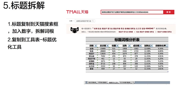 前面准备的备选词库是用词根组成的,替换时自然也是用词根。把标题复制到天猫搜索框,在后面填入数字,系统会自动拆分标题,拆分出来的就是最小单位有效词根。拆分出来的词根复制到工具箱里的标题优化工具的表格里面,自动生成标题每个词根所对应的近30天的数据表现。